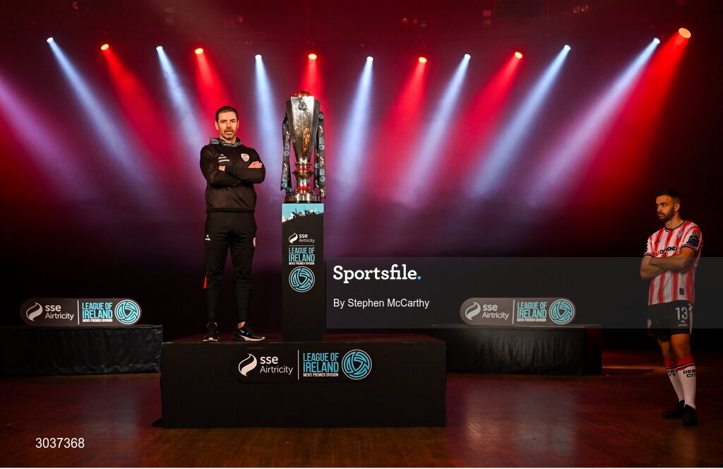 5 February 2025; Derry City manager Tiernan Lynch and Robbie Benson of Derry City during the SSE Airtricity Men’s Premier Division, SSE Airtricity Men’s First Division and SSE Airtricity Women’s Premier Division Launch 2025 at Mansion House in Dublin. Photo by Stephen McCarthy/Sportsfile