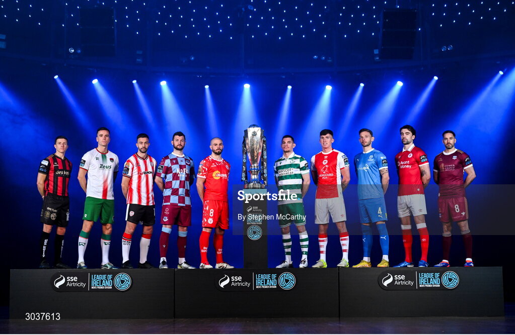 5 February 2025; SSE Airtricity Men’s Premier Division players, from left, Keith Buckley of Bohemians, Charlie Lyons of Cork City, Robbie Benson of Derry City, Ryan Brennan of Drogheda United, Mark Coyle of Shelbourne, Trevor Clarke of Shamrock Rovers, Joe Redmond of St Patrick's Athletic, Andy Boyle of Waterford, John Mahon of Sligo Rovers and Greg Cunningham of Galway United during the SSE Airtricity Men’s Premier Division, SSE Airtricity Men’s First Division and SSE Airtricity Women’s Premier Division Launch 2025 at Mansion House in Dublin. Photo by Stephen McCarthy/Sportsfile