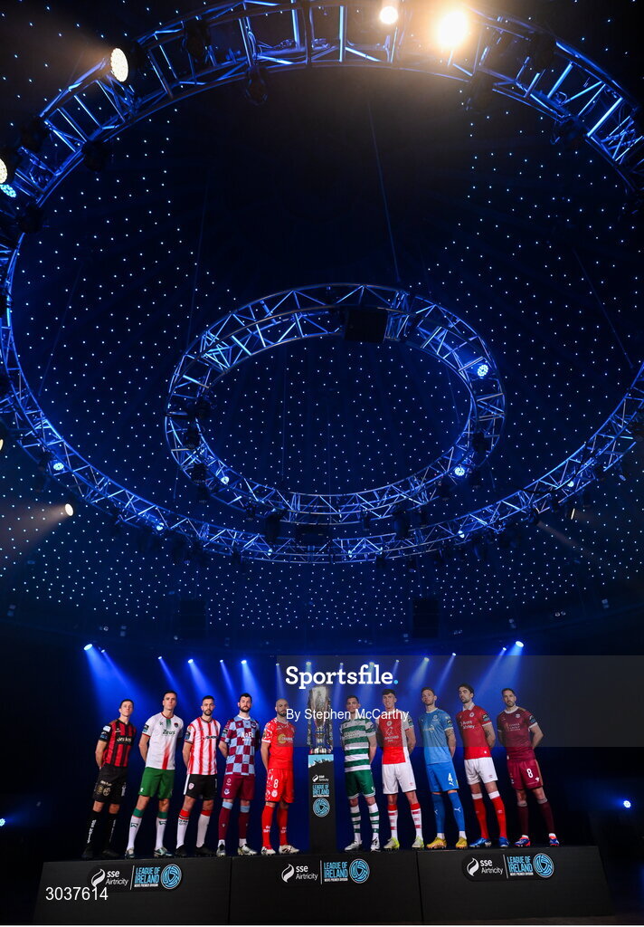 5 February 2025; SSE Airtricity Men’s Premier Division players, from left, Keith Buckley of Bohemians, Charlie Lyons of Cork City, Robbie Benson of Derry City, Ryan Brennan of Drogheda United, Mark Coyle of Shelbourne, Trevor Clarke of Shamrock Rovers, Joe Redmond of St Patrick's Athletic, Andy Boyle of Waterford, John Mahon of Sligo Rovers and Greg Cunningham of Galway United during the SSE Airtricity Men’s Premier Division, SSE Airtricity Men’s First Division and SSE Airtricity Women’s Premier Division Launch 2025 at Mansion House in Dublin. Photo by Stephen McCarthy/Sportsfile