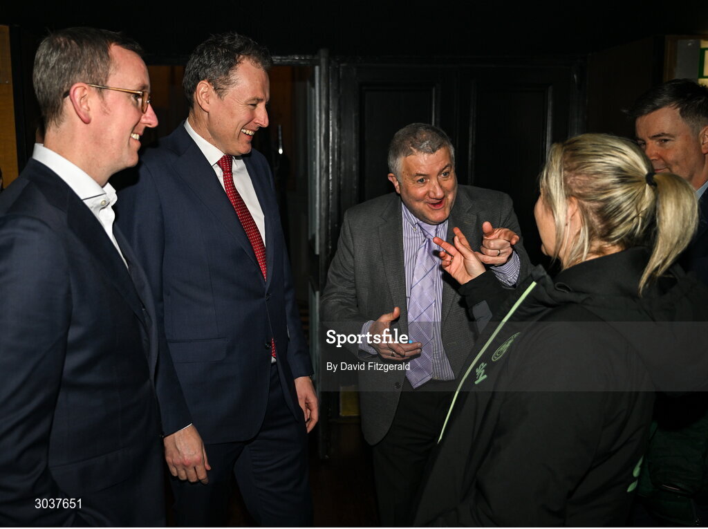 5 February 2025; Minister of State at the Department of Tourism, Culture, Arts, Gaeltacht, Sport and Media with special responsibility for Sport and Postal Policy Charlie McConalogue TD, centre, with FAI chief executive David Courell, left, FAI president Paul Cooke and Republic of Ireland women's national team manager Carla Ward during the SSE Airtricity Men’s Premier Division, SSE Airtricity Men’s First Division and SSE Airtricity Women’s Premier Division Launch 2025 at Mansion House in Dublin. Photo by David Fitzgerald/Sportsfile
