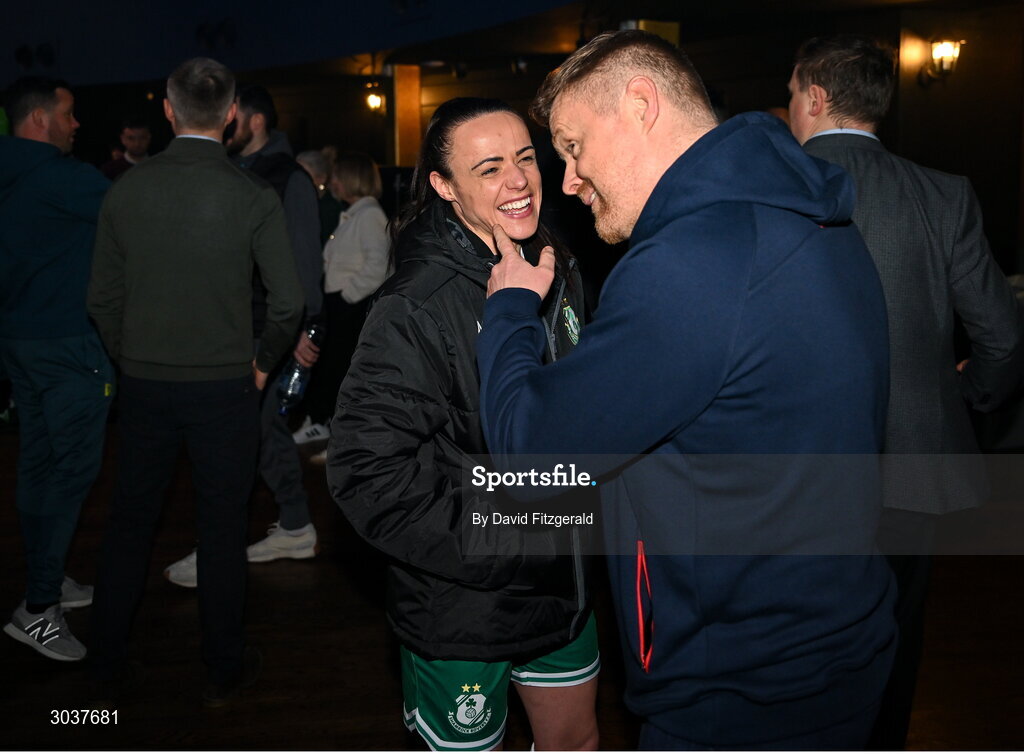 5 February 2025; Shelbourne manager Damien Duff with Aine O'Gorman of Shamrock Rovers during the SSE Airtricity Men’s Premier Division, SSE Airtricity Men’s First Division and SSE Airtricity Women’s Premier Division Launch 2025 at Mansion House in Dublin. Photo by David Fitzgerald/Sportsfile