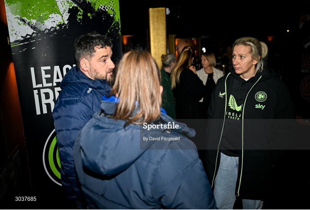 5 February 2025; Republic of Ireland women's national team manager Carla Ward with Galway United manager Phil Trill, left, during the SSE Airtricity Men’s Premier Division, SSE Airtricity Men’s First Division and SSE Airtricity Women’s Premier Division Launch 2025 at Mansion House in Dublin. Photo by David Fitzgerald/Sportsfile