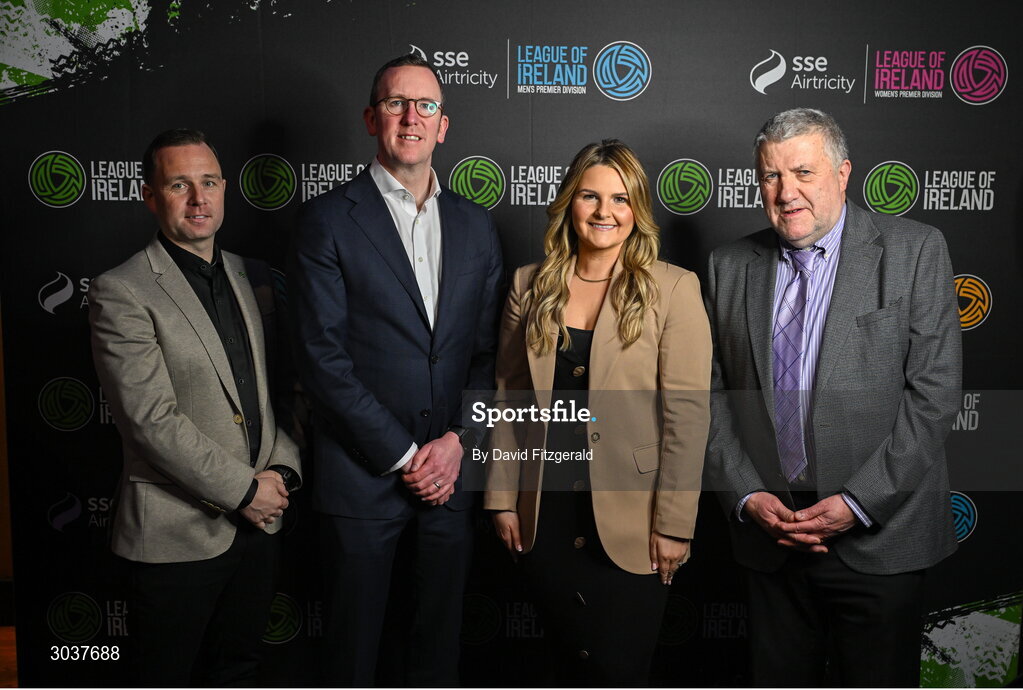 5 February 2025; Ashley Morrow, head of brand, advertising and sponsorship at SSE Airtricity; with, from left, League of Ireland director Mark Scanlon, FAI chief executive David Courell and FAI president Paul Cooke during the SSE Airtricity Men’s Premier Division, SSE Airtricity Men’s First Division and SSE Airtricity Women’s Premier Division Launch 2025 at Mansion House in Dublin. Photo by David Fitzgerald/Sportsfile