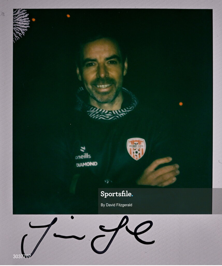 5 February 2025; A polaroid photo of Derry City manager Tiernan Lynch during the SSE Airtricity Men’s Premier Division, SSE Airtricity Men’s First Division and SSE Airtricity Women’s Premier Division Launch 2025 at Mansion House in Dublin. Photo by David Fitzgerald/Sportsfile