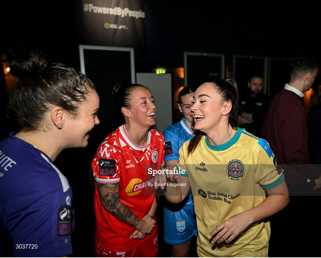 5 February 2025; Players, from left, Ciara Rossiter of Wexford, Pearl Slattery of Shelbourne and Rachel Kelly of Bohemians during the SSE Airtricity Men’s Premier Division, SSE Airtricity Men’s First Division and SSE Airtricity Women’s Premier Division Launch 2025 at Mansion House in Dublin. Photo by David Fitzgerald/Sportsfile