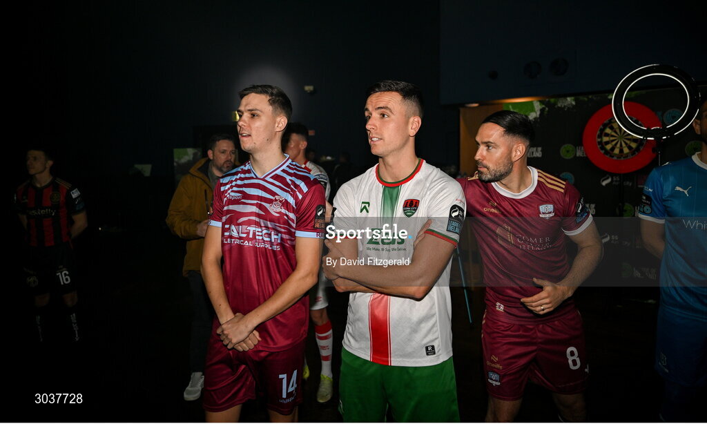 5 February 2025; Players, from left, Cian Coleman of Cobh Ramblers, Charlie Lyons of Cork City and Greg Cunningham of Galway United during the SSE Airtricity Men’s Premier Division, SSE Airtricity Men’s First Division and SSE Airtricity Women’s Premier Division Launch 2025 at Mansion House in Dublin. Photo by David Fitzgerald/Sportsfile