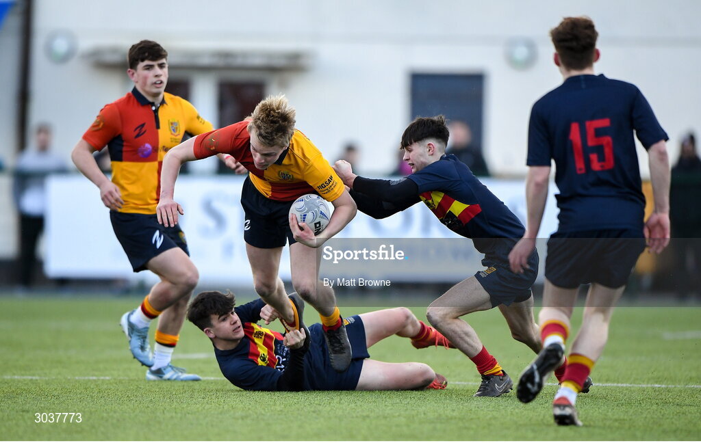 4 February 2025; Rohan O'Shea of St Fintan's High School in action against Temple Carrig School during the Bank of Ireland Leinster Rugby Boys Schools Senior Cup First Round match between Temple Carrig School and St Fintan's High School at Castle Avenue in Dublin. Photo by Matt Browne/Sportsfile