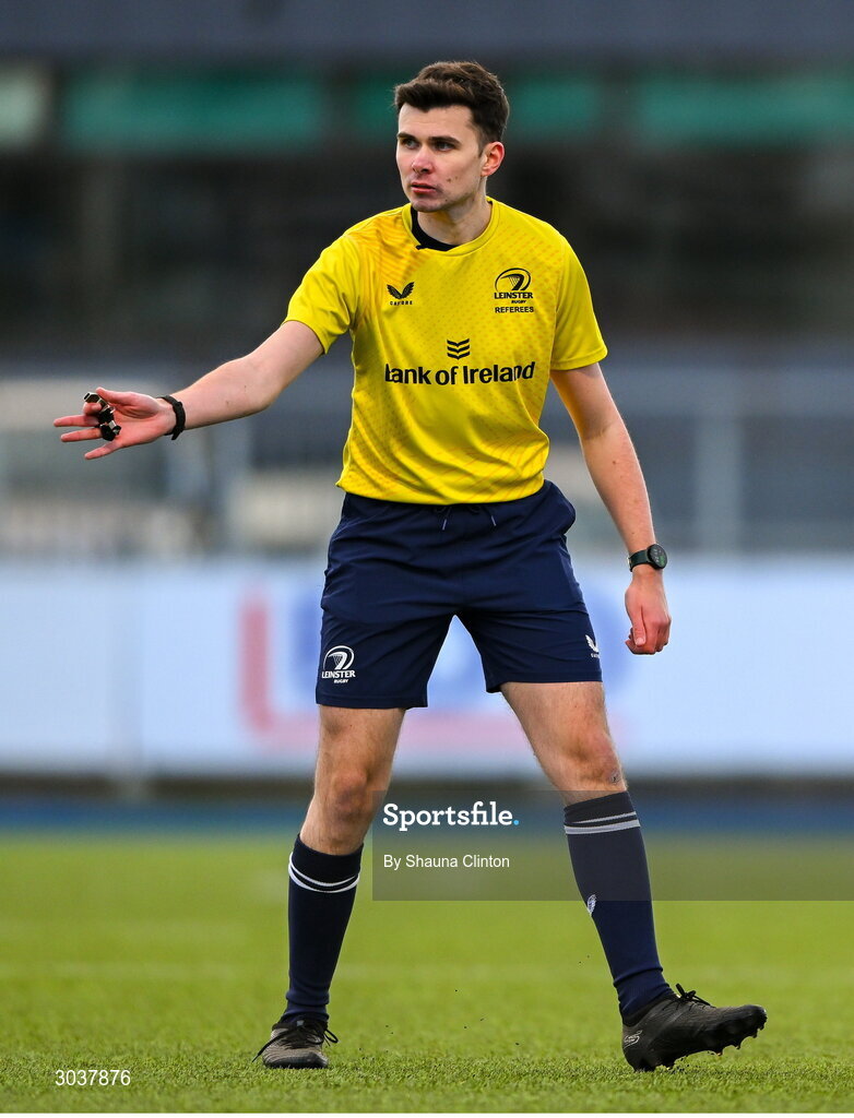 4 February 2025; Referee Kenny Colderick during the Bank of Ireland Leinster Rugby Boys Schools Junior Cup First Round match between Wesley College and Gonzaga College at Energia Park in Dublin. Photo by Shauna Clinton/Sportsfile