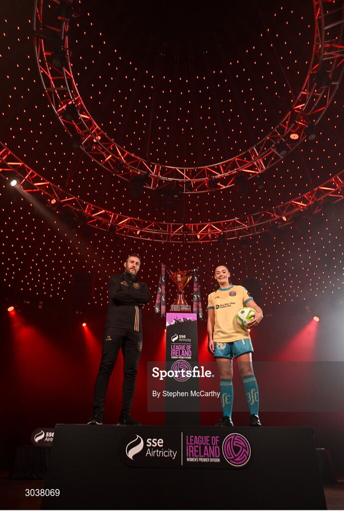 5 February 2025; Bohemians manager Alban Hysa and Rachel Kelly during the SSE Airtricity Men’s Premier Division, SSE Airtricity Men’s First Division and SSE Airtricity Women’s Premier Division Launch 2025 at Mansion House in Dublin. Photo by Stephen McCarthy/Sportsfile