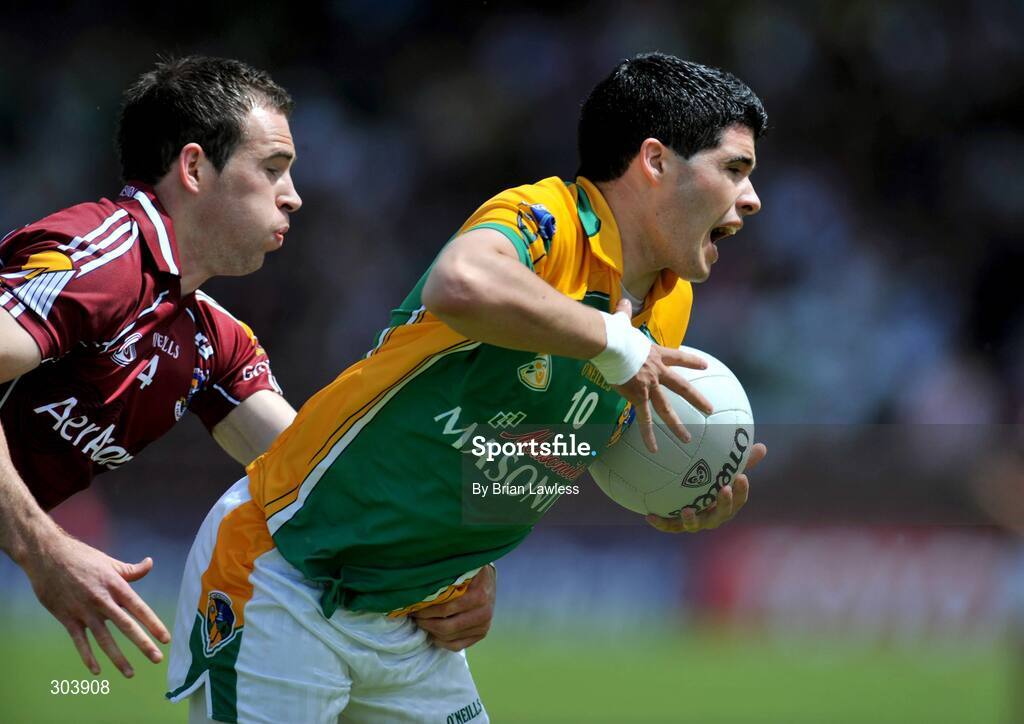 15 June 2008; Emlyn Mulligan, Leitrim, in action against Damien Burke, Galway. GAA Football Connacht Senior Championship Semi-Final, Galway v Leitrim, Pearse Stadium, Galway. Picture credit: Brian Lawless / SPORTSFILE
