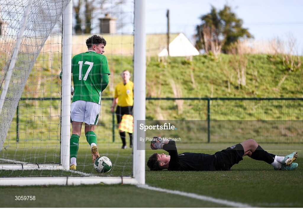 28 February 2025; Josh Harpur of Republic of Ireland celebrates after scoring his side's first goal, from a penalty, during the U16 Boys International Friendly match between Repubic of Ireland and Finland at the FAI National Training Centre in Abbotstown, Dublin. Photo by Piaras Ó Mídheach/Sportsfile