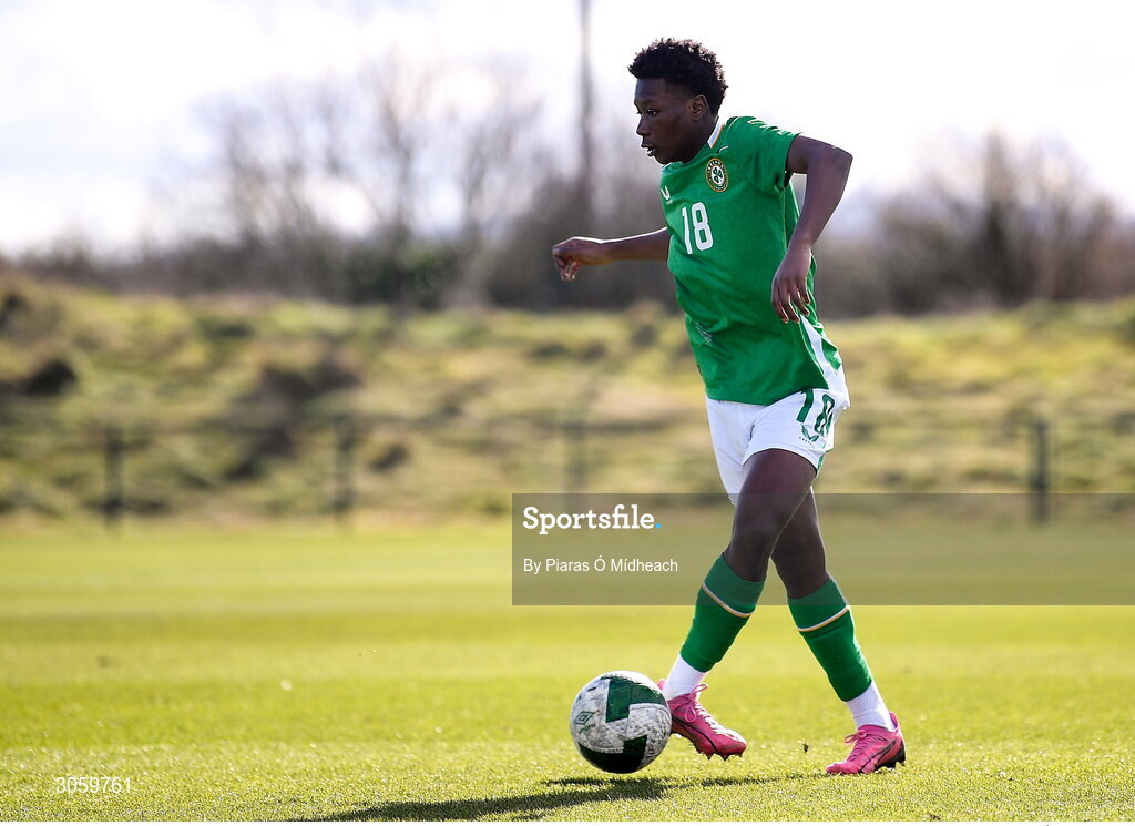 28 February 2025; Noble Tetteh of Republic of Ireland during the U16 Boys International Friendly match between Repubic of Ireland and Finland at the FAI National Training Centre in Abbotstown, Dublin. Photo by Piaras Ó Mídheach/Sportsfile