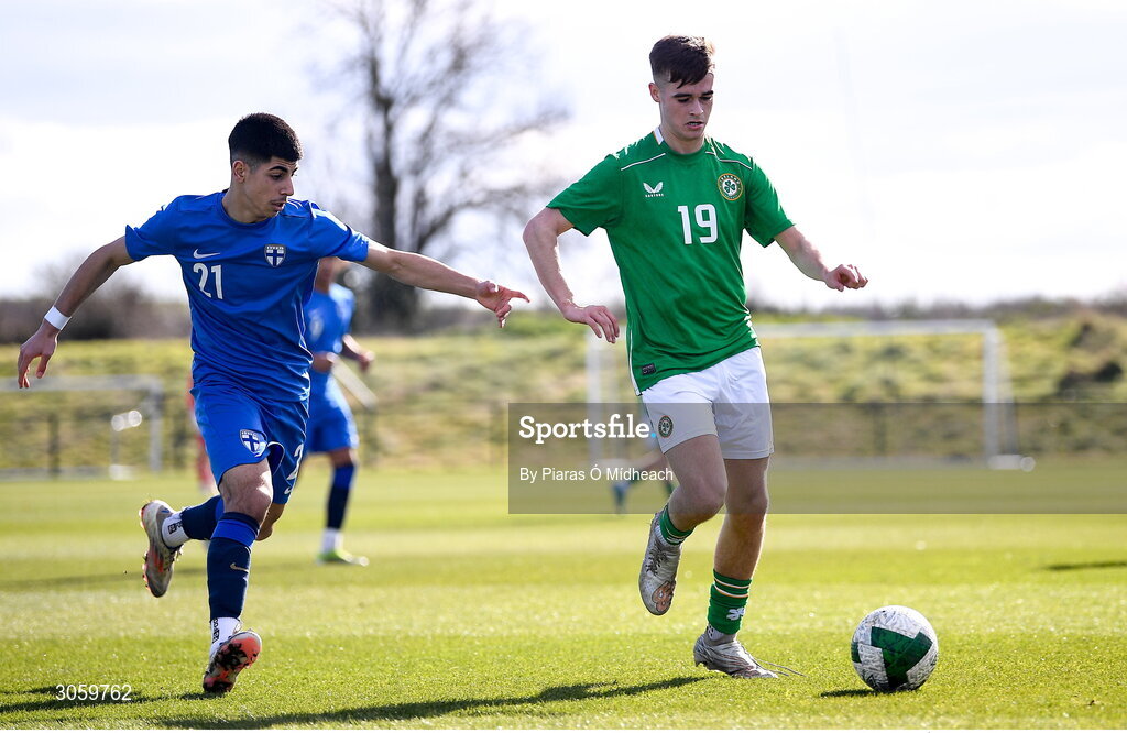 28 February 2025; Curtis Egan of Republic of Ireland in action against Mustafa Mahmood of Finland during the U16 Boys International Friendly match between Repubic of Ireland and Finland at the FAI National Training Centre in Abbotstown, Dublin. Photo by Piaras Ó Mídheach/Sportsfile