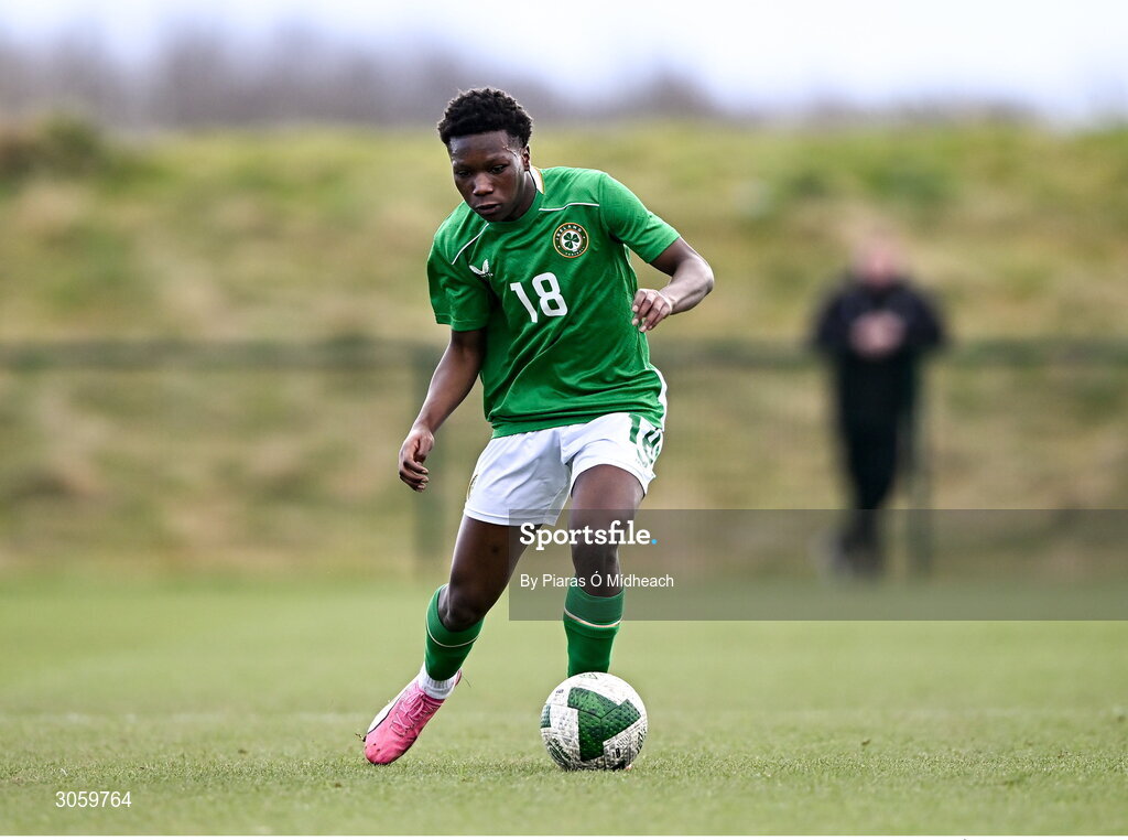 28 February 2025; Noble Tetteh of Republic of Ireland during the U16 Boys International Friendly match between Repubic of Ireland and Finland at the FAI National Training Centre in Abbotstown, Dublin. Photo by Piaras Ó Mídheach/Sportsfile