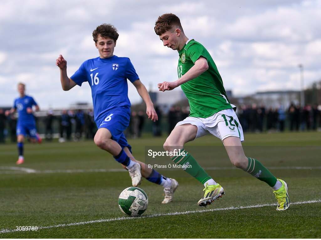 28 February 2025; Danny Burke of Republic of Ireland in action against Tarmo Kuusniemi of Finland during the U16 Boys International Friendly match between Repubic of Ireland and Finland at the FAI National Training Centre in Abbotstown, Dublin. Photo by Piaras Ó Mídheach/Sportsfile