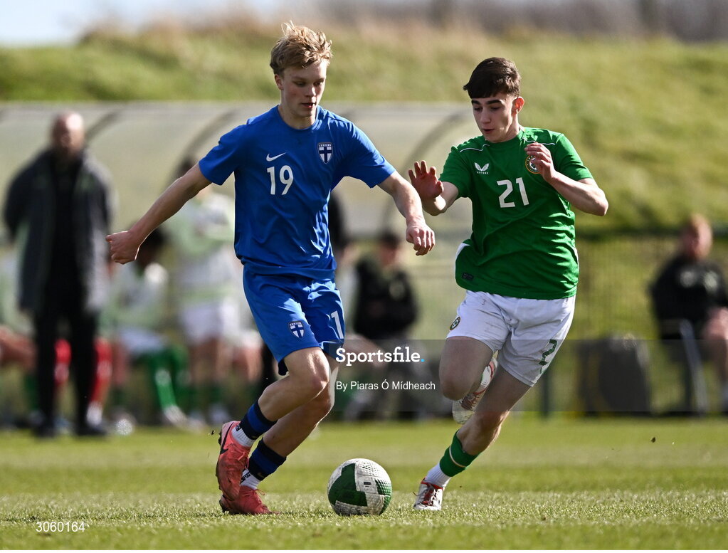 28 February 2025; Rasmus Mendolin of Finland in action against Kian Quigley of Republic of Ireland during the U16 Boys International Friendly match between Repubic of Ireland and Finland at the FAI National Training Centre in Abbotstown, Dublin. Photo by Piaras Ó Mídheach/Sportsfile