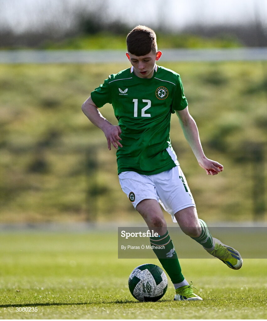 28 February 2025; Danny Burke of Republic of Ireland during the U16 Boys International Friendly match between Repubic of Ireland and Finland at the FAI National Training Centre in Abbotstown, Dublin. Photo by Piaras Ó Mídheach/Sportsfile
