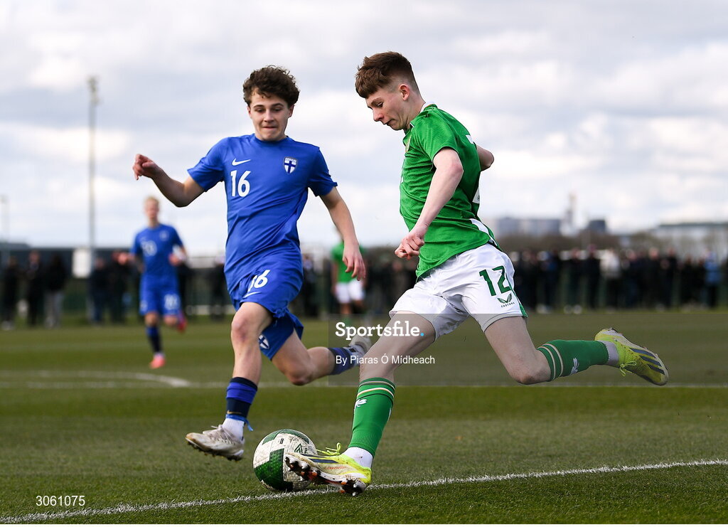 28 February 2025; Danny Burke of Republic of Ireland in action against Tarmo Kuusniemi of Finland during the U16 Boys International Friendly match between Repubic of Ireland and Finland at the FAI National Training Centre in Abbotstown, Dublin. Photo by Piaras Ó Mídheach/Sportsfile
