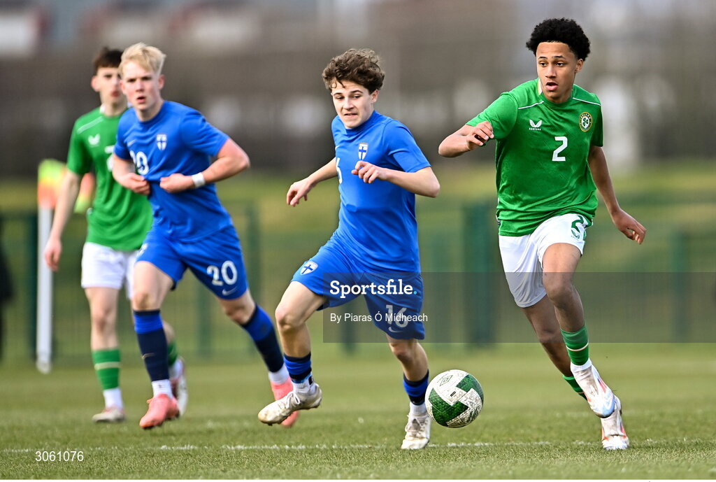28 February 2025; Aidan Gabbidon of Republic of Ireland in action against Tarmo Kuusniemi of Finland during the U16 Boys International Friendly match between Repubic of Ireland and Finland at the FAI National Training Centre in Abbotstown, Dublin. Photo by Piaras Ó Mídheach/Sportsfile