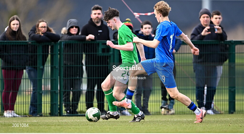 28 February 2025; Josh O'Connor of Republic of Ireland in action against Rasmus Mendolin of Finland during the U16 Boys International Friendly match between Repubic of Ireland and Finland at the FAI National Training Centre in Abbotstown, Dublin. Photo by Piaras Ó Mídheach/Sportsfile