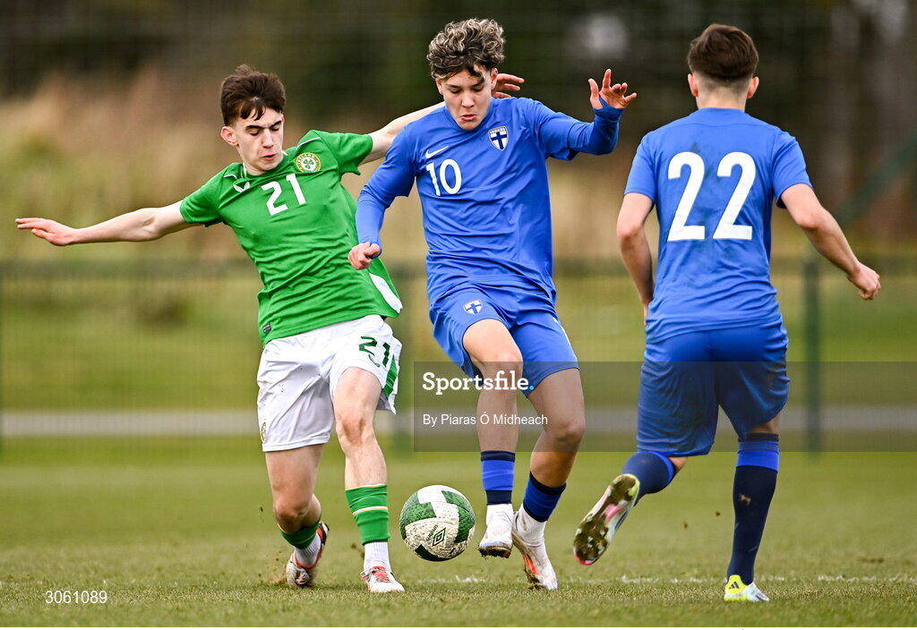 28 February 2025; Aaron Korkala of Finland in action against Kian Quigley of Republic of Ireland during the U16 Boys International Friendly match between Repubic of Ireland and Finland at the FAI National Training Centre in Abbotstown, Dublin. Photo by Piaras Ó Mídheach/Sportsfile
