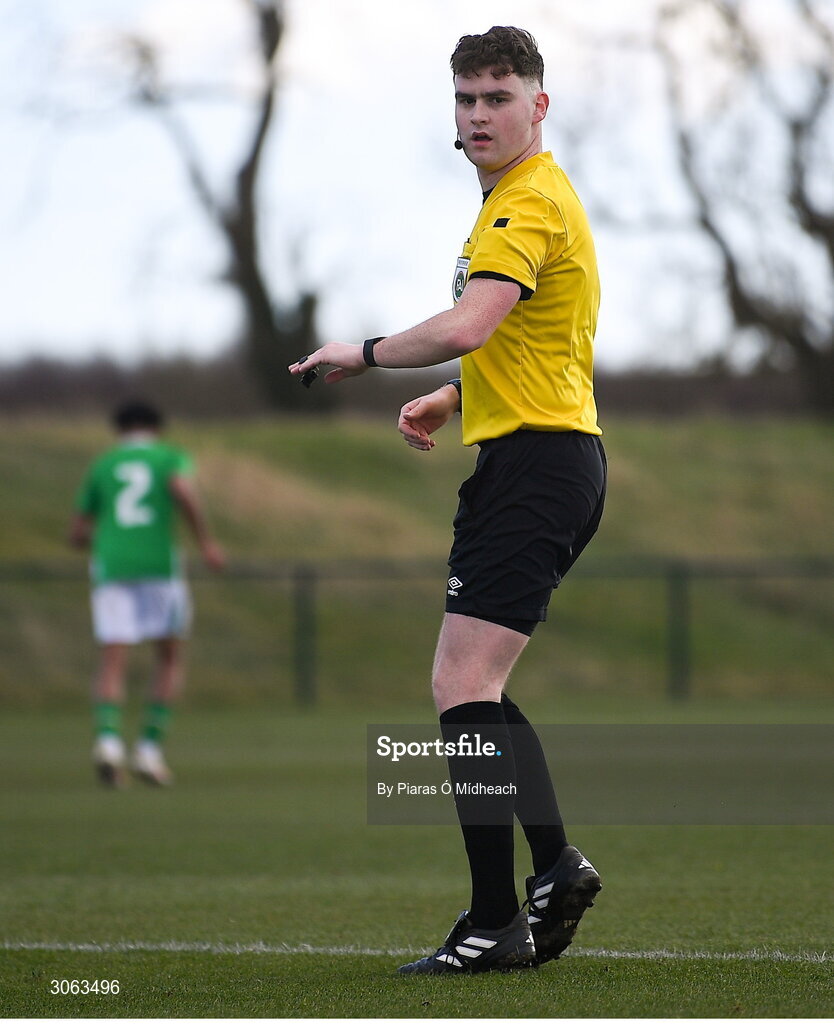 28 February 2025; Referee Eoghan McAuliffe during the U16 Boys International Friendly match between Repubic of Ireland and Finland at the FAI National Training Centre in Abbotstown, Dublin. Photo by Piaras Ó Mídheach/Sportsfile