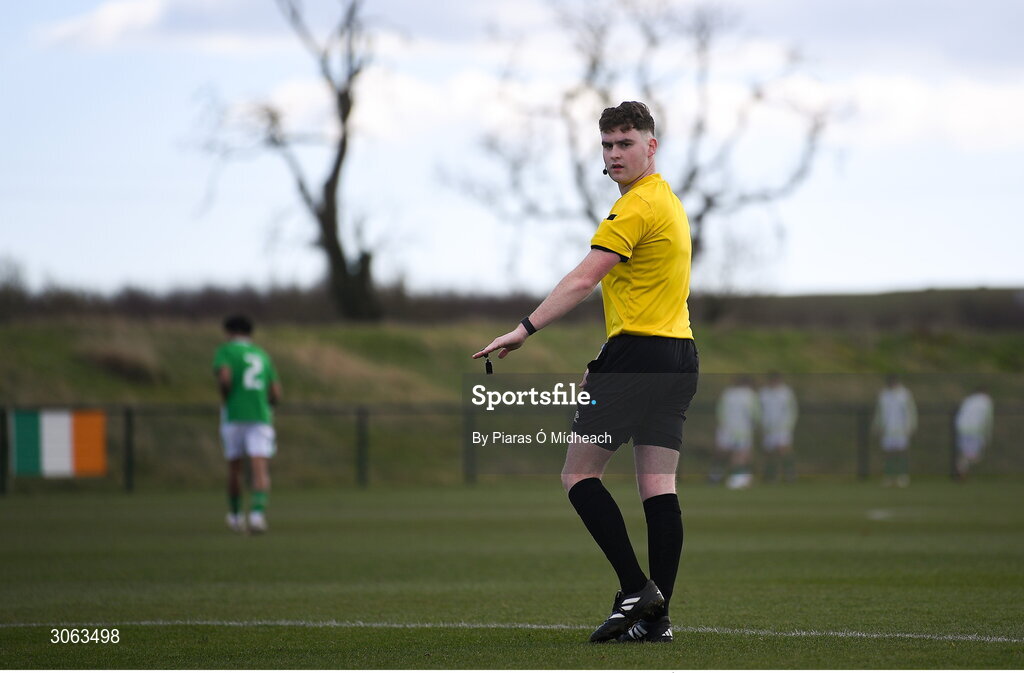 28 February 2025; Referee Eoghan McAuliffe during the U16 Boys International Friendly match between Repubic of Ireland and Finland at the FAI National Training Centre in Abbotstown, Dublin. Photo by Piaras Ó Mídheach/Sportsfile