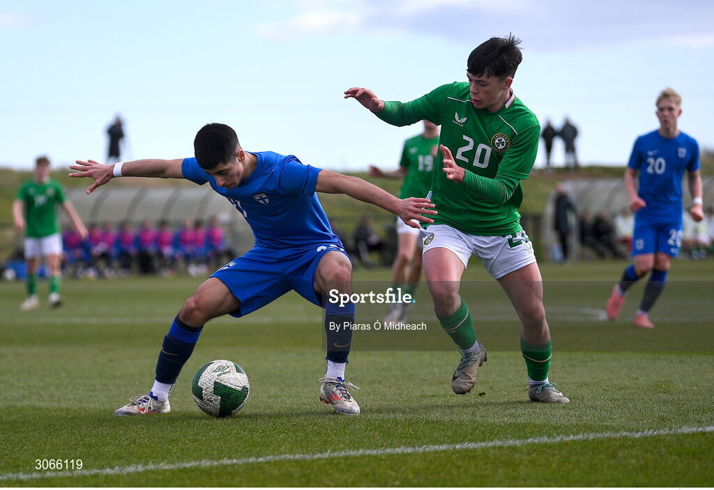 28 February 2025; Mustafa Mahmood of Finland in action against Bobby Keoghan of Republic of Ireland during the U16 Boys International Friendly match between Repubic of Ireland and Finland at the FAI National Training Centre in Abbotstown, Dublin. Photo by Piaras Ó Mídheach/Sportsfile