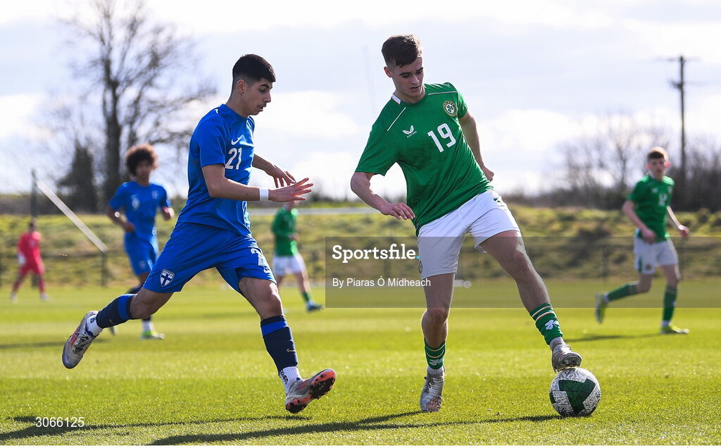 28 February 2025; Curtis Egan of Republic of Ireland in action against Mustafa Mahmood of Finland during the U16 Boys International Friendly match between Repubic of Ireland and Finland at the FAI National Training Centre in Abbotstown, Dublin. Photo by Piaras Ó Mídheach/Sportsfile