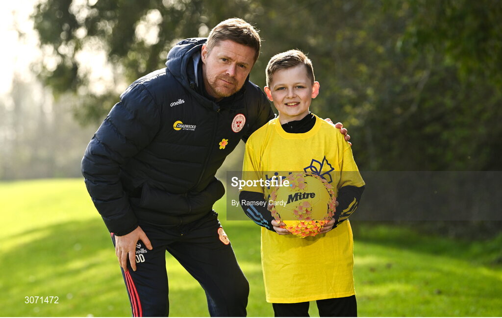 11 March 2025; Paint the Town Yellow: Damien Duff joins cancer patient Oscar Walsh at AUL Complex in Dublin, in encouraging the Irish public to go all in for Daffodil Day on Friday, March 28th. This Daffodil Day the Irish Cancer Society urgently needs your support to provide free services for cancer patients. Without you these vital services simply wouldn’t exist. Visit cancer.ie/daffodilday for more information. Photo by Ramsey Cardy/Sportsfile