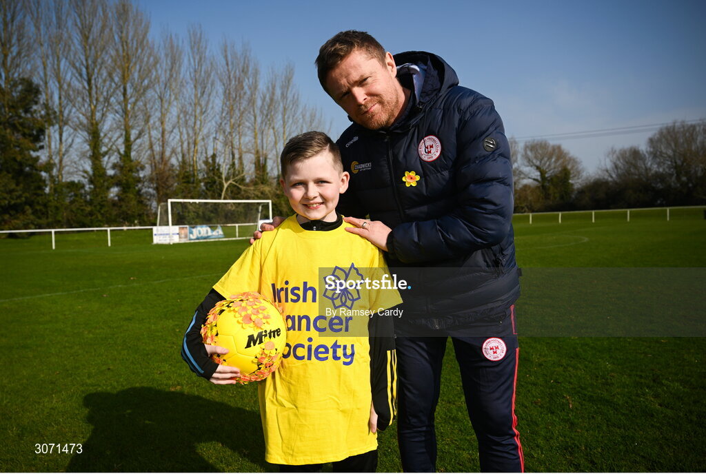 11 March 2025; Paint the Town Yellow: Damien Duff joins cancer patient Oscar Walsh at AUL Complex in Dublin, in encouraging the Irish public to go all in for Daffodil Day on Friday, March 28th. This Daffodil Day the Irish Cancer Society urgently needs your support to provide free services for cancer patients. Without you these vital services simply wouldn’t exist. Visit cancer.ie/daffodilday for more information. Photo by Ramsey Cardy/Sportsfile