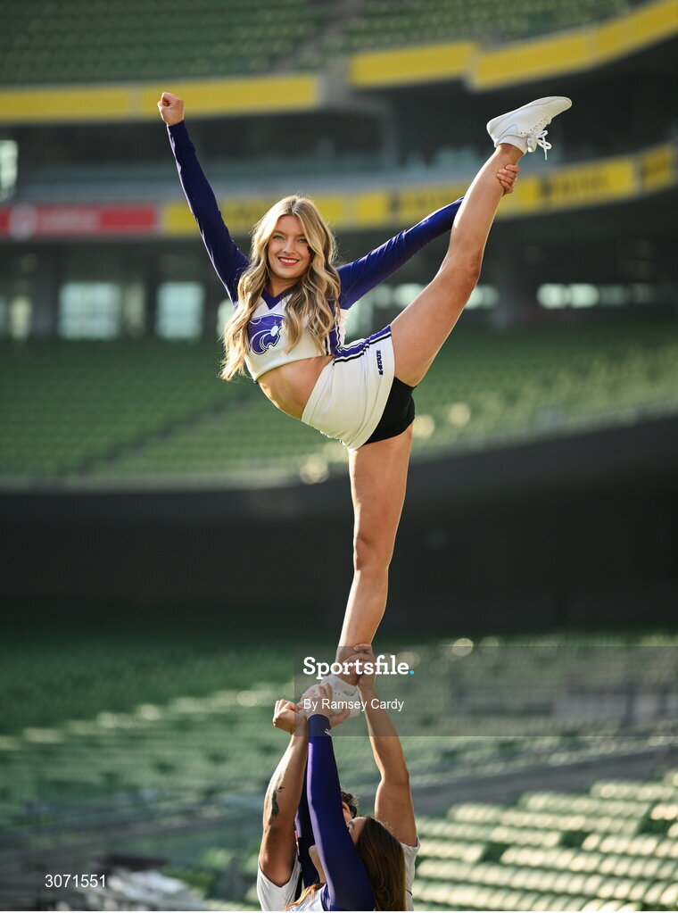10 March 2025; Iowa State University Cheerleader member Katelyn Egan at the Aviva Stadium Dublin as tickets for the 2025 Aer Lingus College Football Classic between Kansas State University and Iowa State University are on sale now at www.ticketmaster.ie/collegefootball. The fixture will take place at the Aviva Stadium, Dublin, on Saturday, 23rd August 2025 and limited tickets are available. Photo by Ramsey Cardy/Sportsfile