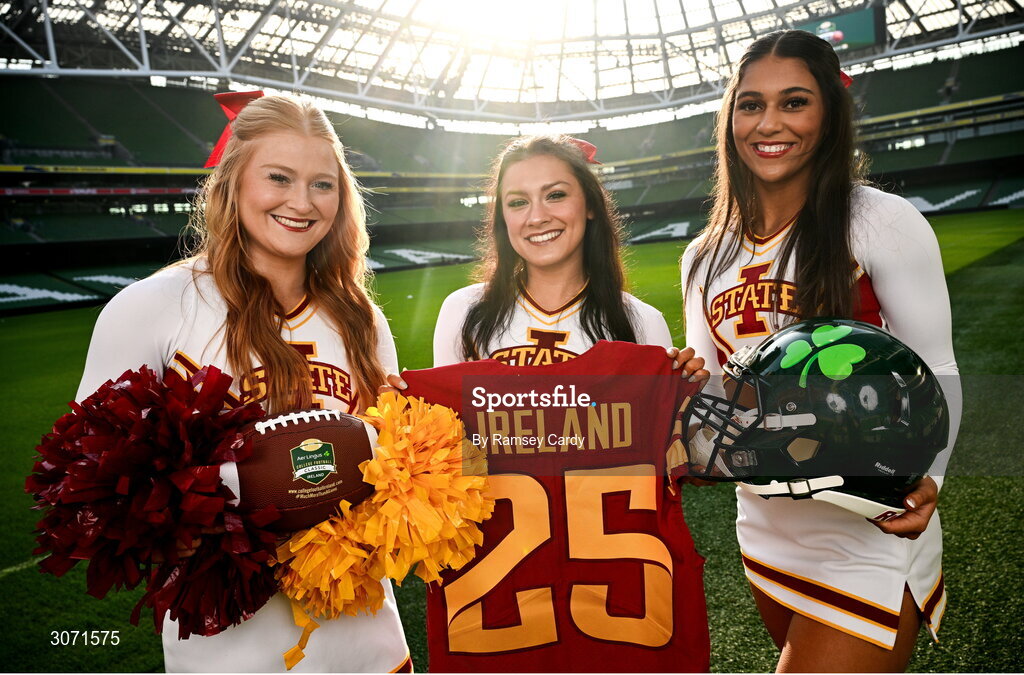 10 March 2025; Iowa State University Cheerleader members, from left, Bailey Houston, Grace Krouse and Natalie Maxwell, at the Aviva Stadium Dublin as tickets for the 2025 Aer Lingus College Football Classic between Kansas State University and Iowa State University are on sale now at www.ticketmaster.ie/collegefootball. The fixture will take place at the Aviva Stadium, Dublin, on Saturday, 23rd August 2025 and limited tickets are available. Photo by Ramsey Cardy/Sportsfile