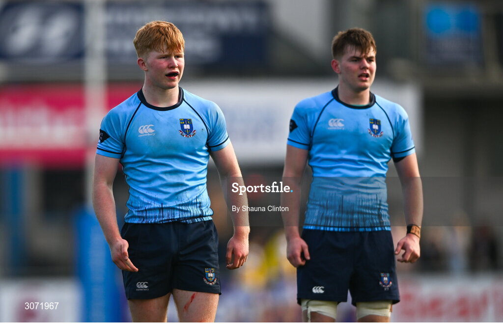 10 March 2025; St Michael's College players, Harry McCafferty, left, and Dara Elliott during the Bank of Ireland Leinster Rugby Boys Schools Junior Cup semi-final match between St Michael's College and Clongowes Wood College at Energia Park in Dublin. Photo by Shauna Clinton/Sportsfile