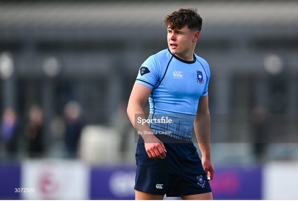 10 March 2025; Toby O'Leary of St Michael's College during the Bank of Ireland Leinster Rugby Boys Schools Junior Cup semi-final match between St Michael's College and Clongowes Wood College at Energia Park in Dublin. Photo by Shauna Clinton/Sportsfile