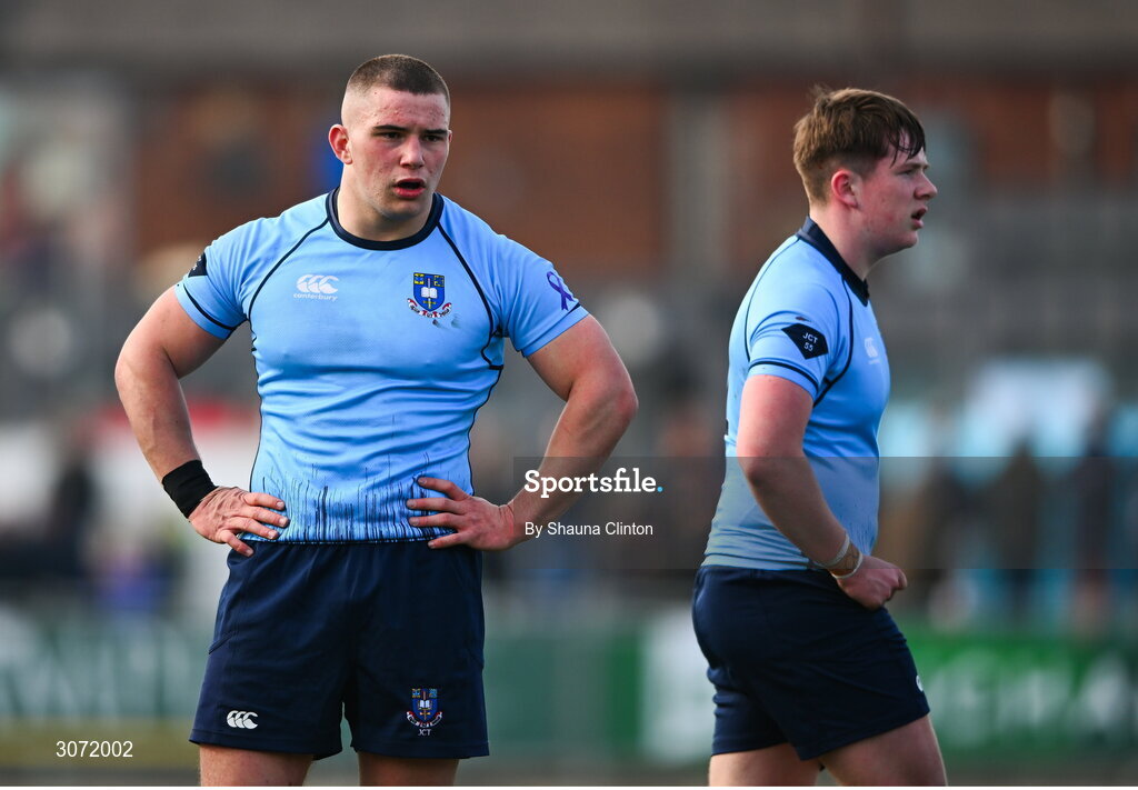 10 March 2025; St Michael's College captain Herbie Boyle, left, and team-mate Joshua Neville during the Bank of Ireland Leinster Rugby Boys Schools Junior Cup semi-final match between St Michael's College and Clongowes Wood College at Energia Park in Dublin. Photo by Shauna Clinton/Sportsfile