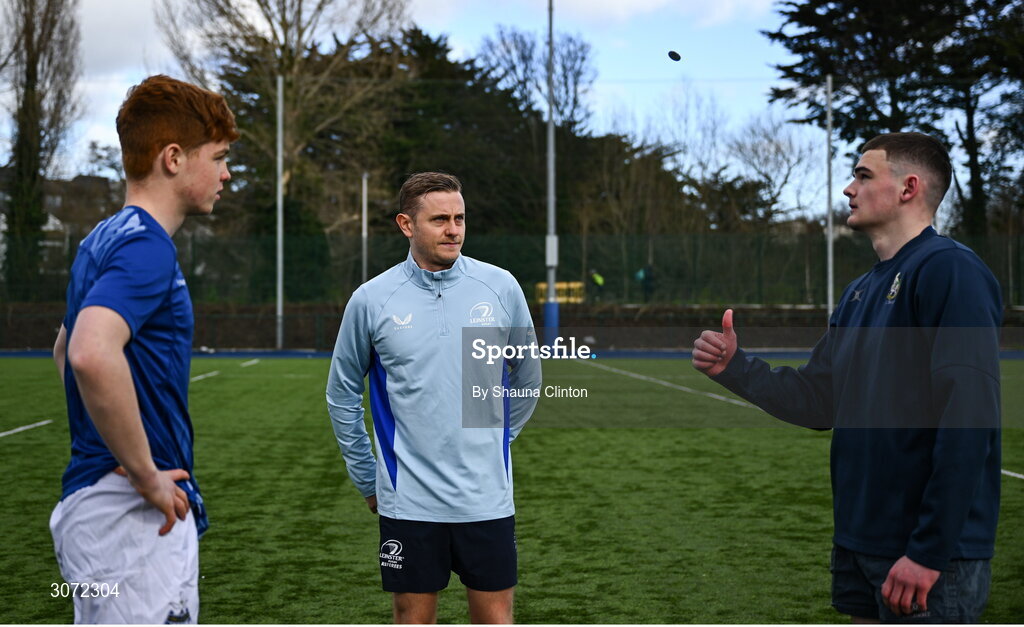 11 March 2025; Referee Mitch Enderby with Blackrock College captain Paul Harnett, left, and St Vincent's Castleknock College captain Matthew Lynch during the coin toss before the Bank of Ireland Leinster Rugby Boys Schools Junior Cup semi-final match between Blackrock College and St Vincent's Castleknock College at Energia Park in Dublin. Photo by Shauna Clinton/Sportsfile