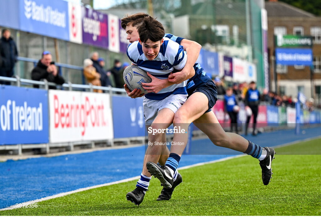 11 March 2025; Tim Daly of Blackrock College is tackled by Luuk Jackson of St Vincent's Castleknock College during the Bank of Ireland Leinster Rugby Boys Schools Junior Cup semi-final match between Blackrock College and St Vincent's Castleknock College at Energia Park in Dublin. Photo by Shauna Clinton/Sportsfile