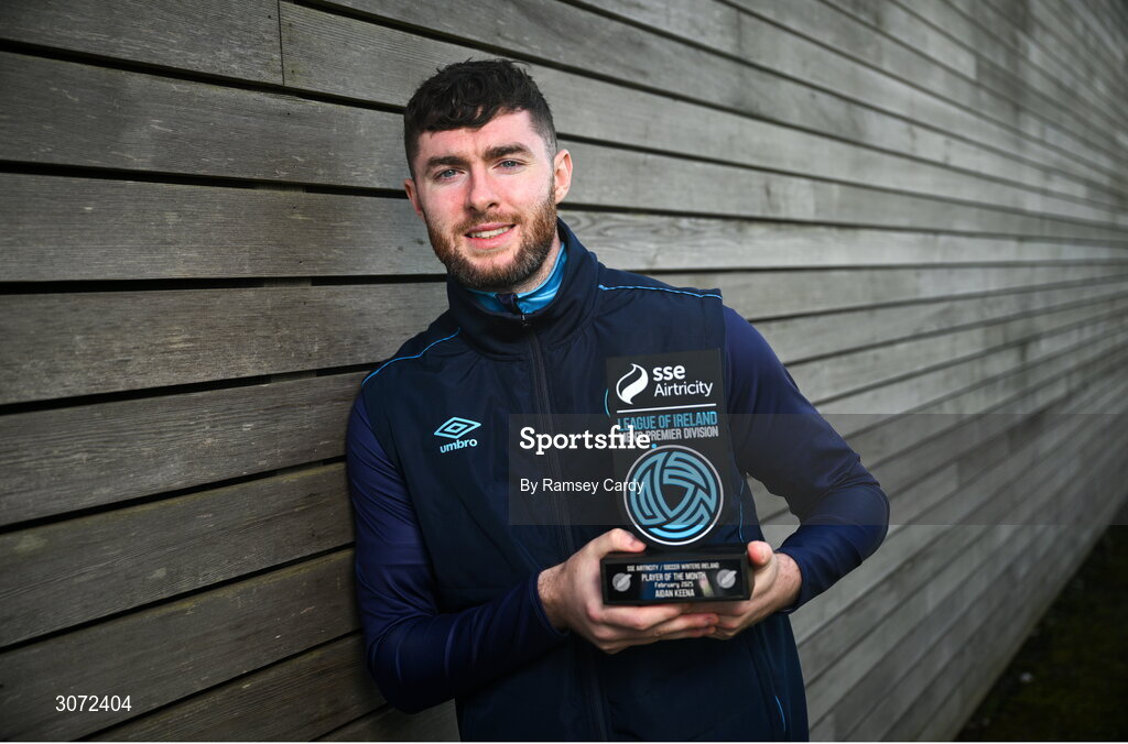 12 March 2025; Aidan Keena of St Patrick's Athletic with his SSE Airtricity / SWI Player of the Month Award for February 2025 at the Sport Ireland Campus in Dublin. Photo by Ramsey Cardy/Sportsfile