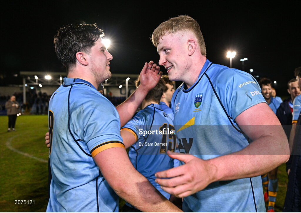 13 March 2025; Conor O'Tighearhaigh, right, and Dan Barron of UCD celebrate after their sides victory in the annual men’s Rugby Colours match between Dublin University and UCD at UCD Bowl in Dublin. Photo by Sam Barnes/Sportsfile