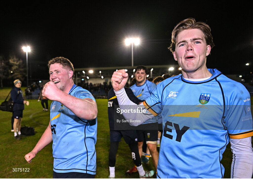 13 March 2025; Daragh Gilbourne, right, and Chris Hennessy of UCD celebrate after their sides victory in the annual men’s Rugby Colours match between Dublin University and UCD at UCD Bowl in Dublin. Photo by Sam Barnes/Sportsfile