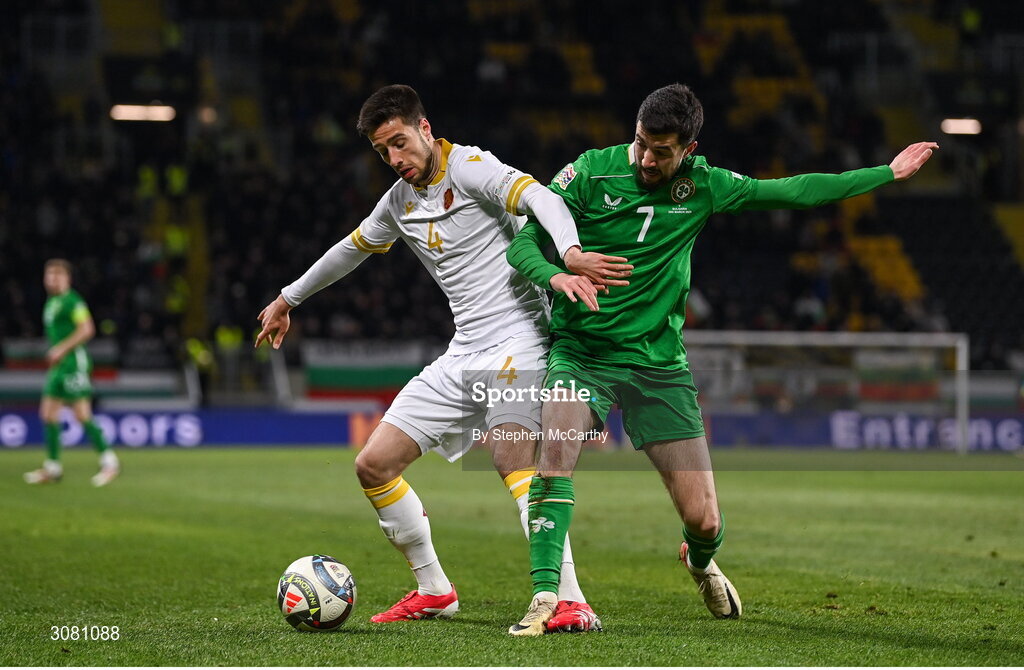 20 March 2025; Ilia Gruev of Bulgaria in action against Finn Azaz of Republic of Ireland during the UEFA Nations League B/C Play-off 1st Leg match between Bulgaria and Republic of Ireland at Hristo Botev Stadium in Plovdiv, Bulgaria. Photo by Stephen McCarthy/Sportsfile