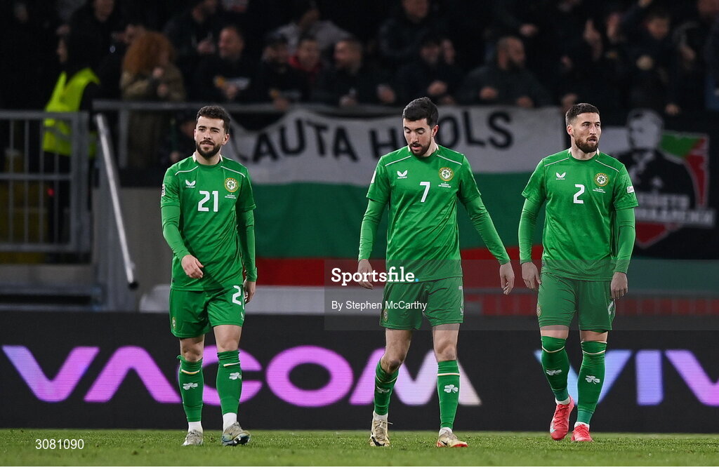 20 March 2025; Republic of Ireland players, from left, Mikey Johnston, Finn Azaz and Matt Doherty after their side conceded a first goal during the UEFA Nations League B/C Play-off 1st Leg match between Bulgaria and Republic of Ireland at Hristo Botev Stadium in Plovdiv, Bulgaria. Photo by Stephen McCarthy/Sportsfile