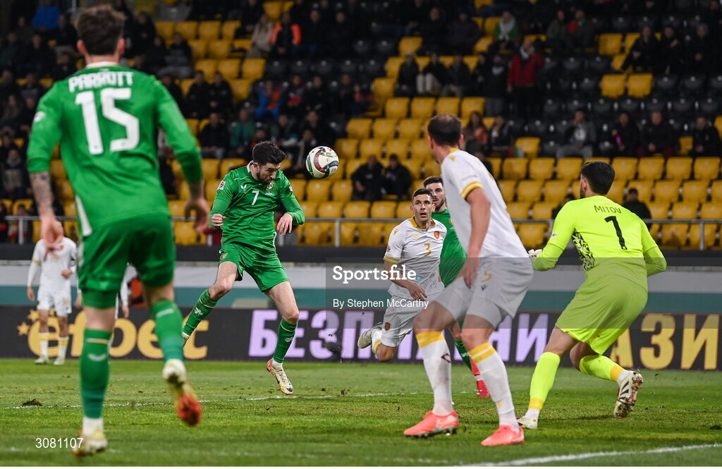 20 March 2025; Finn Azaz of Republic of Ireland scores his side's first goal during the UEFA Nations League B/C Play-off 1st Leg match between Bulgaria and Republic of Ireland at Hristo Botev Stadium in Plovdiv, Bulgaria. Photo by Stephen McCarthy/Sportsfile