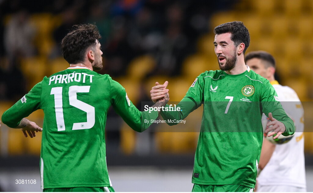 20 March 2025; Finn Azaz of Republic of Ireland, right, celebrates with teammate Troy Parrott after scoring their side's first goal during the UEFA Nations League B/C Play-off 1st Leg match between Bulgaria and Republic of Ireland at Hristo Botev Stadium in Plovdiv, Bulgaria. Photo by Stephen McCarthy/Sportsfile