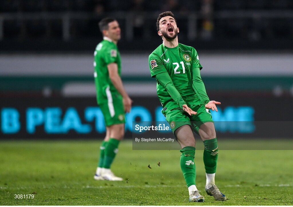 20 March 2025; Mikey Johnston of Republic of Ireland reacts during the UEFA Nations League B/C Play-off 1st Leg match between Bulgaria and Republic of Ireland at Hristo Botev Stadium in Plovdiv, Bulgaria. Photo by Stephen McCarthy/Sportsfile