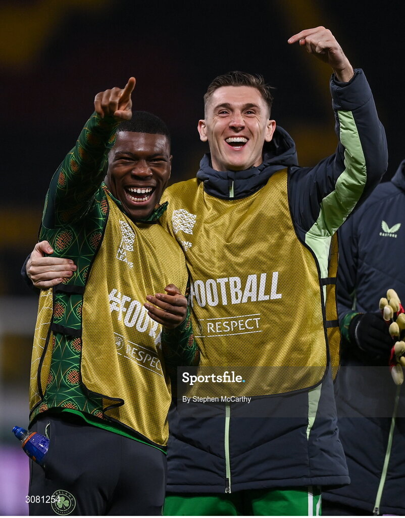 20 March 2025; Republic of Ireland players Sinclair Armstrong, left, and Jimmy Dunne celebrate after the UEFA Nations League B/C Play-off 1st Leg match between Bulgaria and Republic of Ireland at Hristo Botev Stadium in Plovdiv, Bulgaria. Photo by Stephen McCarthy/Sportsfile