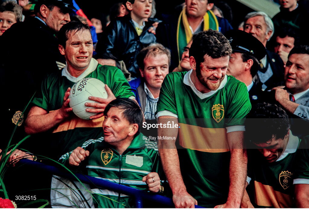 21 September 1986; Kerry players Páidí Ó Sé, left, kitman Leo Griffin and Eoin Liston celebrate after the All-Ireland Senior Football Championship Final between Kerry and Tyrone in Croke Park, Dublin. Photo by Ray McManus/Sportsfile