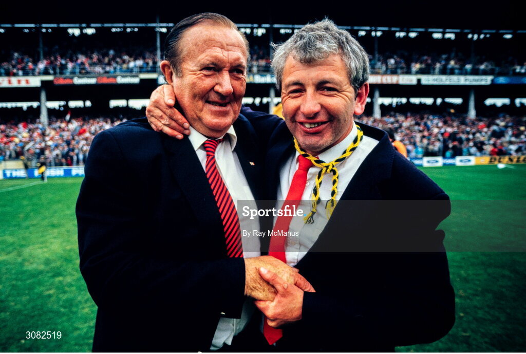 21 September 1986; Kerry selector Joe Keohane, left, celebrates with a supporter after the All-Ireland Senior Football Championship final between Kerry and Tyrone in Croke Park, Dublin. Photo by Ray McManus/Sportsfile