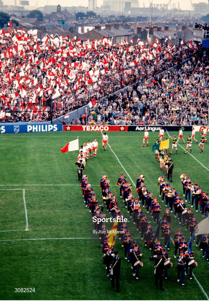 21 September 1986; The Artane Boys Band lead the teams in the pre-match parade before the All-Ireland Senior Football Championship final between Tyrone and Kerry at Croke Park in Dublin. Photo by Ray McManus/Sportsfile